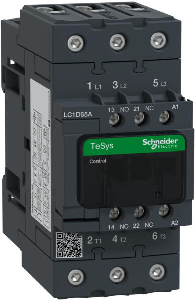 TeSys D kontaktor, 3 pólusú (3NO), motorvezérlő alkalmazásokhoz 65A/440V AC-3 (37kW@400V) feszültségig. 24V 50/60Hz AC tekercset, 1NO+1NC beépített segédérintkezőket (NC tükör tanúsítvánnyal), teljesítménycsatlakozást EverLink BTR csavaros csatlakozókkal, vezérléscsatlakozást csavaros kapcsos csatlakozókkal biztosít. A 3600 ciklus/óráig terjedő működési sebesség és 60°C-ig terjedő környezet esetén nagy megbízhatóságot és tartósságot biztosít. Kompakt (55 mm szélesség), DIN-sínre vagy csavaros rögzítéssel. Több szabvány szerinti tanúsítás (IEC, UL, CSA, CCC, EAC, Marine), Green Premium szabványnak megfelelő (RoHS/REACh).