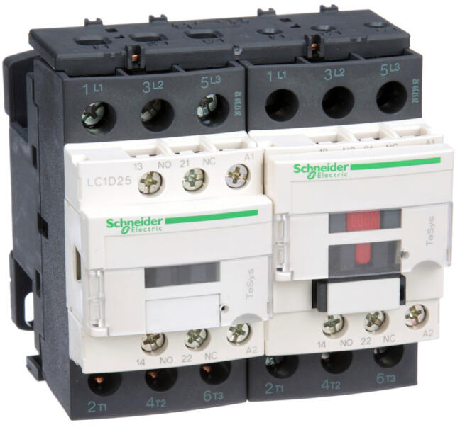 AC irányváltó, 11kW/25A (400V, AC3), csavaros csatlakozás, 1Z+1NY. termékcsalád: TeSys - termék neve: TeSys D - készülék rövid megnevezése: LC2D - mágneskapcsoló alkalmazás: ellenálló töltés, motorvezérlés - felhasználási kategória: AC-1, AC-3 - eszköz bemutatása: gyárilag összeszerelt irányváltó erősáramú gyűjtősínnel - pólusok megnevezése: 3P - pólus érintkező összetétel: 3 NO - Ue névleges üzemi feszültség: