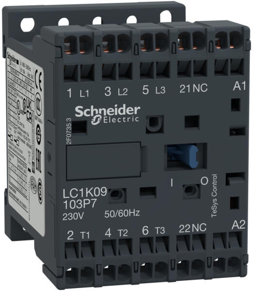 Védőrelé TeSys LC1-K, 3-pólusú, AC-3 440 V 6A, tekercs 230 V AC. termékcsalád: TeSys - termék vagy komponens típusa: mágneskapcsoló - termék neve: TeSys K - készülék rövid megnevezése: LC1K - készülékalkalmazás: ellenőrzés - mágneskapcsoló alkalmazás: motorvezérlés. Előnyök : tényezőt, valamint az összes alkalmazásba való zökkenőmentes beillesztést kínálja... Alkalmazások: Ipar, infrastruktúra, épületautomatizálás: Egyszerű vezérlőrendszerek Zajra érzékeny területek, nagy zavarójellel rendelkező hálózatok: csendes működésű mágneskapcsoló. .