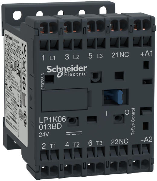 Védőrelé TeSys LP1-K, 3-pólusú, AC-3 440 V 9A, tekercs 24 V DC. termékcsalád: TeSys - termék vagy komponens típusa: mágneskapcsoló - termék neve: TeSys K - készülék rövid megnevezése: LP1K - készülékalkalmazás: ellenőrzés - mágneskapcsoló alkalmazás: ellenálló töltés, motorvezérlés. Előnyök : tényezőt, valamint az összes alkalmazásba való zökkenőmentes beillesztést kínálja... Alkalmazások: Ipar, infrastruktúra, épületautomatizálás: Egyszerű vezérlőrendszerek Zajra érzékeny területek, nagy zavarójellel rendelkező hálózatok: csendes működésű mágneskapcsoló. .